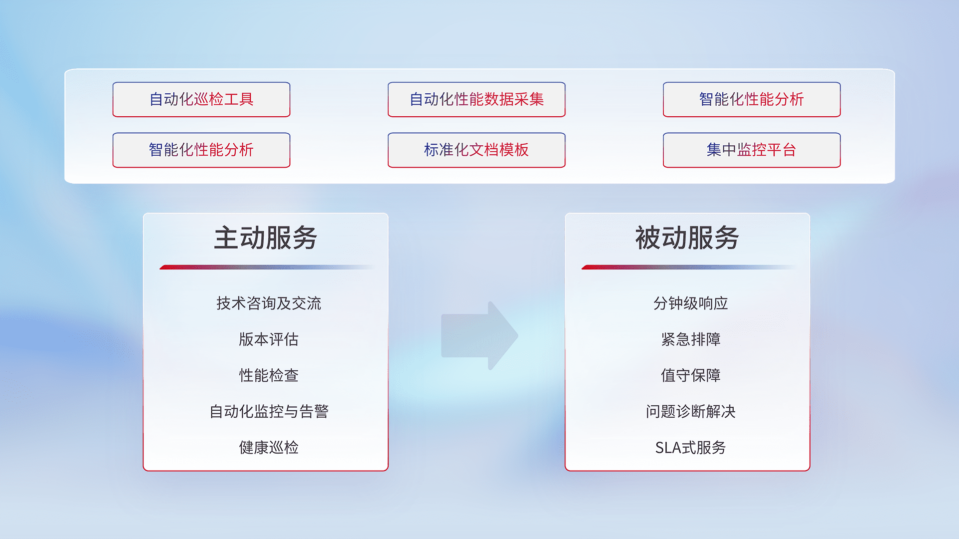 智能化工具和标准化文档,,,,保障服务质量,,,提供主动服务(包含技术咨询、、、、版本评估、、性能检查、、自动化监控与告警、、、健康巡检)和被动服务包含(分钟级响应、、、、紧急排障、、值守保障、、、问题诊断解决、、、SLA服务)。。。